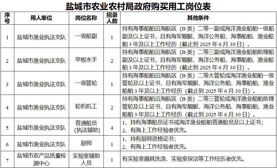盐城市渔业执法支队劳动合同制船员11名,工作地点为射阳县黄沙港镇市渔政执法基地、渔政执法船;盐城市农产品质量检测中心劳动合同制工勤人员1名,工作地点为盐城市亭湖区。人员性质为政府购买服务用工,具体岗位表见附件1。