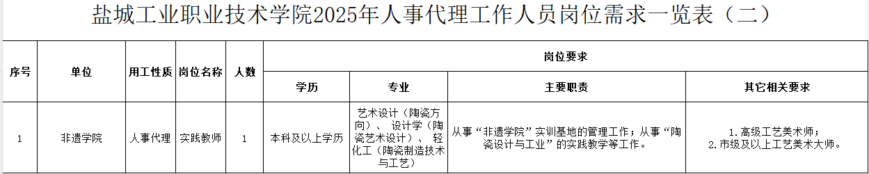 附件1:盐城工业职业技术学院2025年人事代理工作人员岗位需求一览表(二)