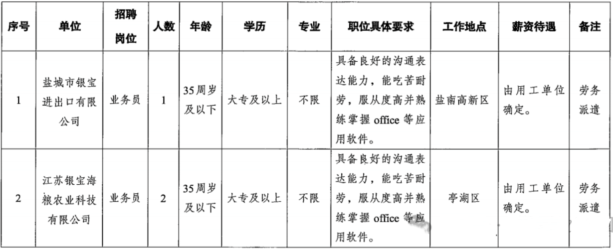因工作需要,盐城市银宝集团下属三级公司盐城市银宝进出口有限公司、江苏银宝海粮农业科技有限公司委托盐城市人力资源服务有限公司面向社会公开招聘劳务派遣人员,现将有关事项公告如下:
