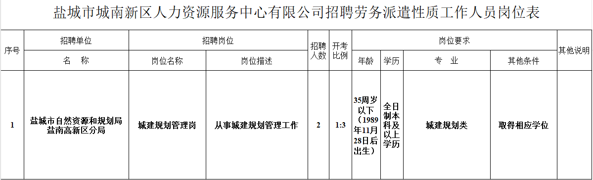 招聘工作人员2名,具体招聘岗位及招聘条件等详见《盐城市城南新区人力资源服务中心有限公司招聘劳务派遣性质工作人员岗位表》(附件1)。