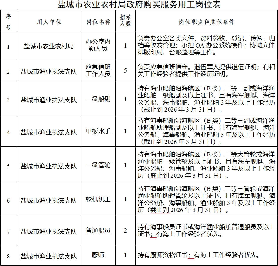 盐城市农业农村局办公室内勤人员1名,盐城市渔业执法支队应急值班工作人员5名、渔政执法船船员7名(具体岗位表见附件),人员性质为政府购买服务用工。市农业农村局机关岗位工作地点在市亭湖区文港中路106号,市渔业执法支队岗位工作地点在市亭湖区瑞鹤路268号、市渔政执法基地(射阳县黄沙港镇)、渔政执法船。