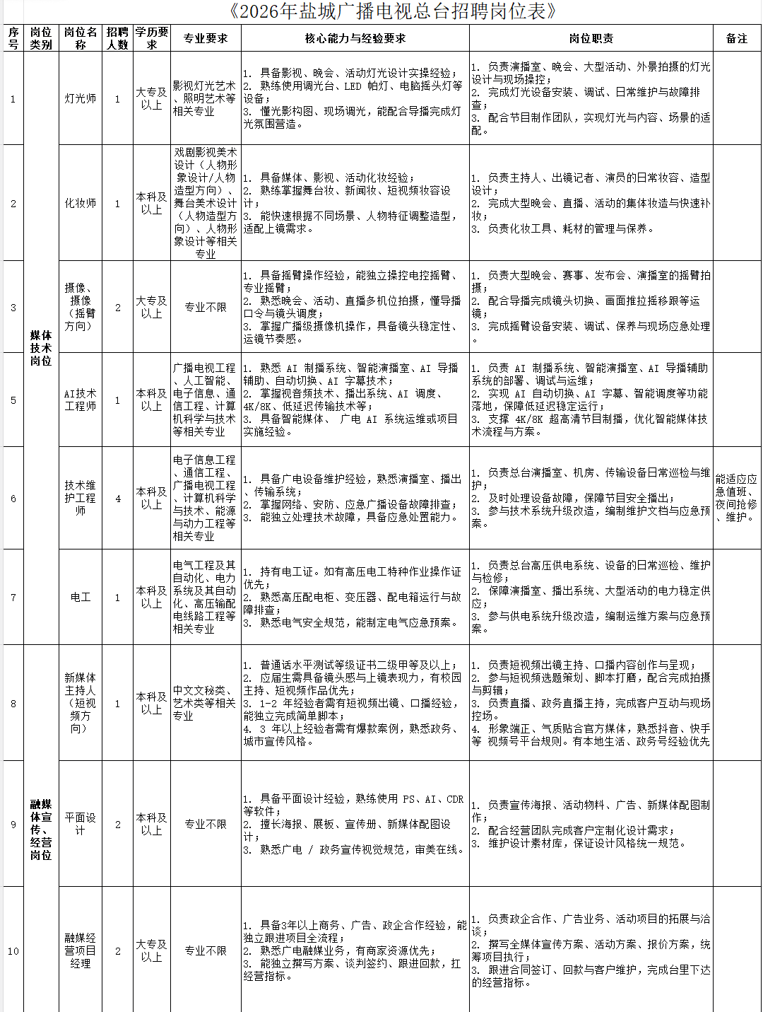 详见《2026年盐城广播电视总台招聘岗位表》。