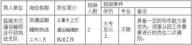 因工作需要,盐城市交通运输局所属盐城市交通运输综合行政执法支队决定面向社会公开招录政府购买服务用工人员2名,有关事项公告如下: