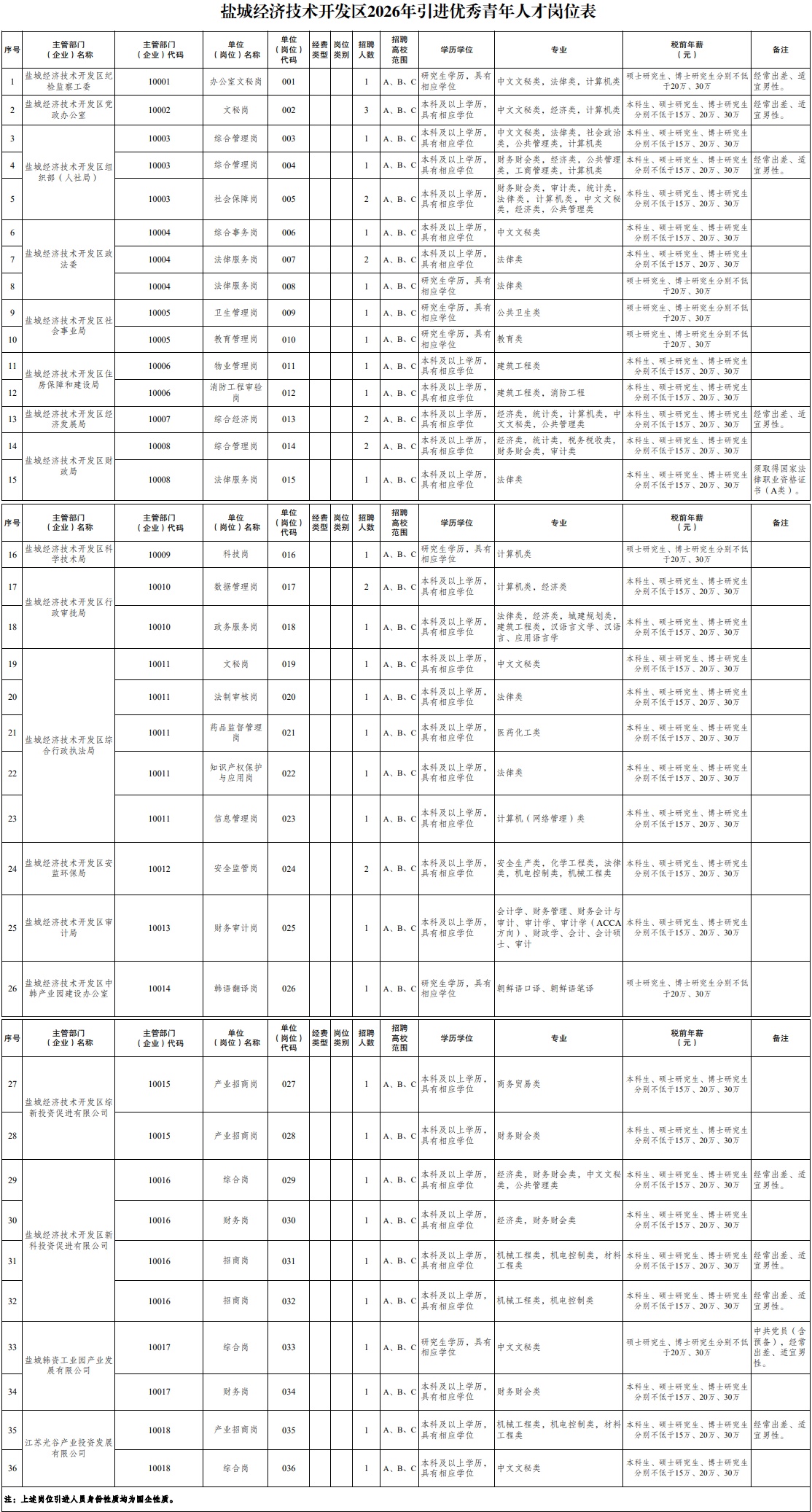 引进单位、岗位、人数和相关要求详见《江苏省盐城经济技术开发区2026年引进优秀青年人才岗位表》。