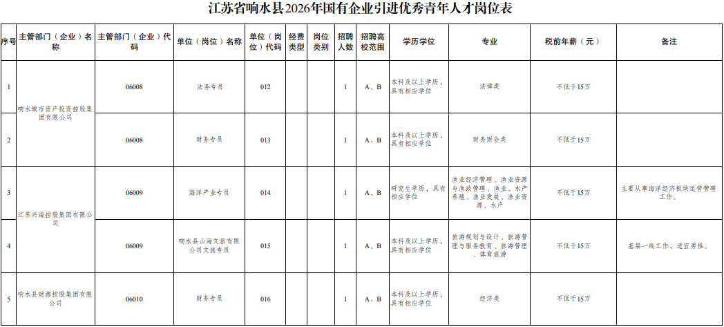 引进单位、岗位、人数和相关要求详见《江苏省响水县2026年国有企业引进优秀青年人才岗位表》(附件1)。