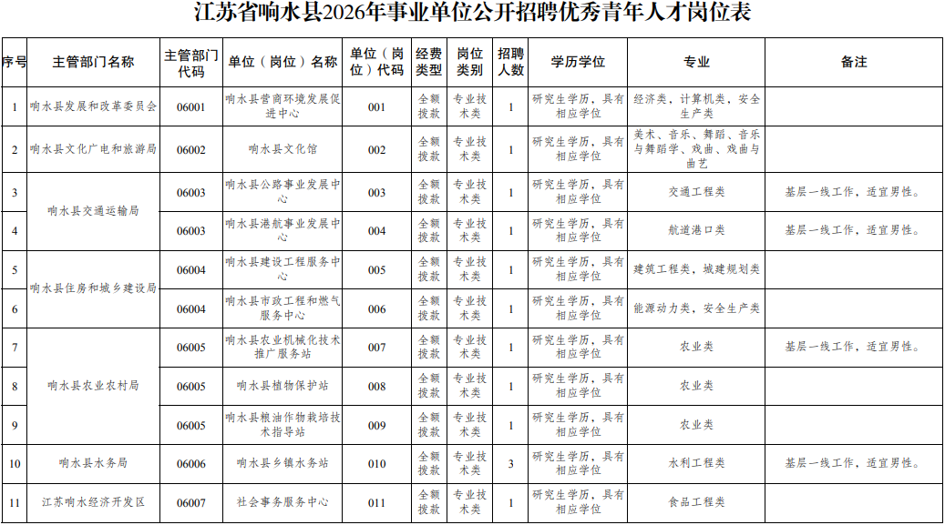 附件: 江苏省响水县2026年事业单位公开招聘优秀青年人才岗位表