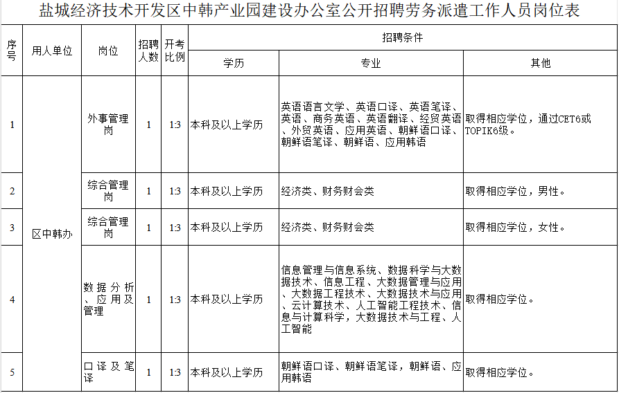 具体岗位及岗位招聘条件等详见《盐城经济技术开发区中韩产业园建设办公室公开招聘劳务派遣工作人员岗位表》(附件1,以下简称《岗位表》)。