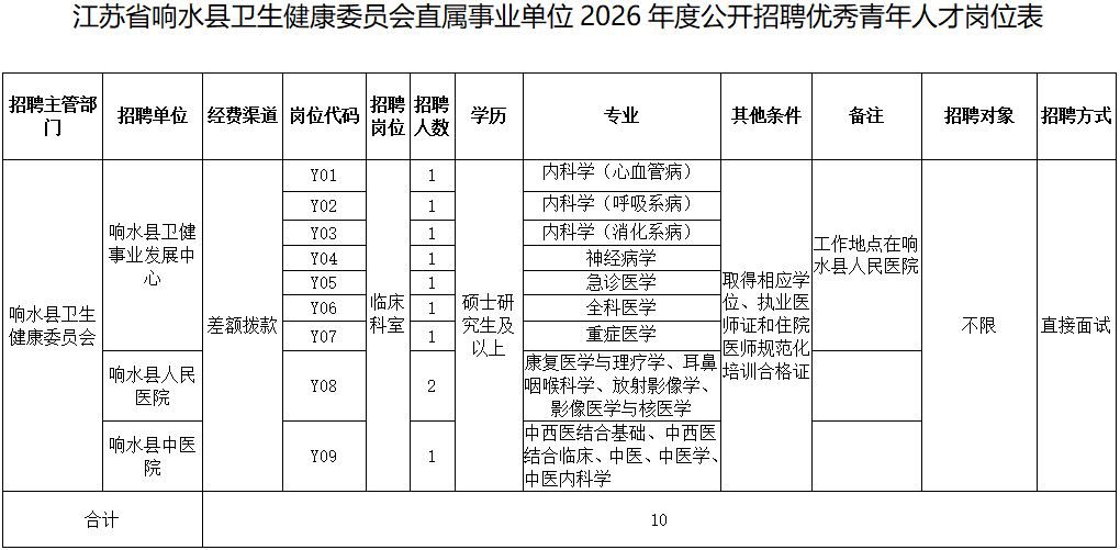 具体岗位及招聘条件等详见《江苏省响水县卫生健康委员会直属事业单位2026年度公开招聘优秀青年人才岗位表》(以下简称《岗位表》)(附件1)。